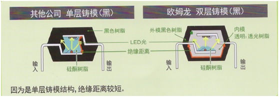 歐姆龍MOS FET繼電器高絕緣型雖然采用了黑色樹脂,但由于是雙層鑄模構造,因此可確保較長的絕緣距離,實現了高絕緣性。DIP、SOP系列產品新增黑色封裝,DIP:支持AC5000V;SOP:支持AC3750V