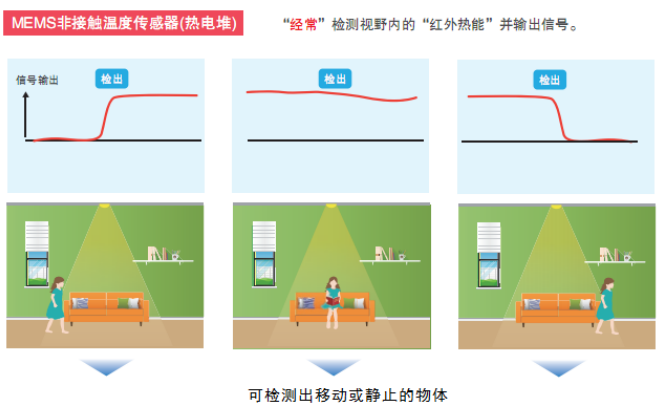 歐姆龍自主研發的D6T系列非接觸溫度傳感器, 采用獨創的MEMS技術,將熱電堆元件和ASIC封裝在一起,實現了精度高,體積小,便于嵌入多種電子產品等特點。與熱釋電型紅外傳感器相比, 歐姆龍D6T系列非接觸傳感器不僅可以檢測動態物體,也可檢測靜止物體。通過物體表面細微的溫度差和溫度變化進行檢測, 不僅適用于家電節能、安防設備、樓宇建筑等領域,也適用于護理看護類的應用場景。