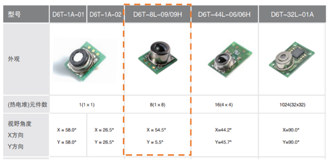 歐姆龍非接觸溫度傳感器D6T-8L-09以其紅外測檢測,I2C數字輸出,抗干擾性強三大優勢為您的產品增加人體感應功能,讓您的產品穩定可靠,獨具特色。此傳感器像素為1x8,檢測區域呈長條形,橫向視場角54.5°,縱向視場角 5.5°,可根據產品的實際應用進行安裝角度調整。