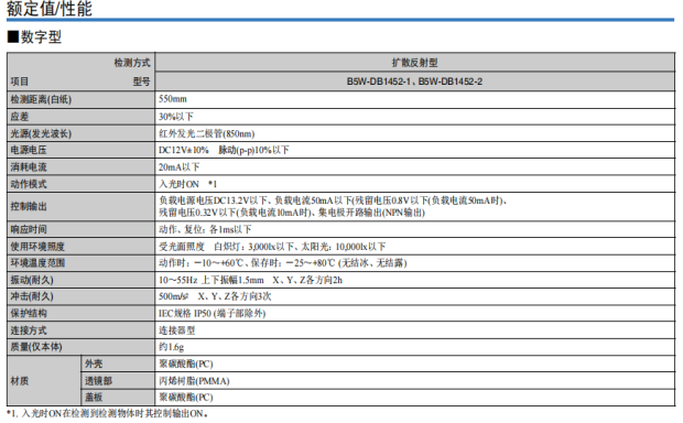 歐姆龍B5W-DB的光源為紅外發(fā)光二極管(850nm),受光面照度在白熾燈的情況下為3,000lx以下、太陽光的照度下為10,000lx以下。不僅如此,B5W-DB的外殼采用聚碳酸酯(PC)、透鏡部采用丙烯樹脂(PMMA)、蓋板采用聚碳酸酯(PC)材質,保護結構符合IEC規(guī)格IP50標準(端子部除外),可幫助設備實現(xiàn)強耐用性。