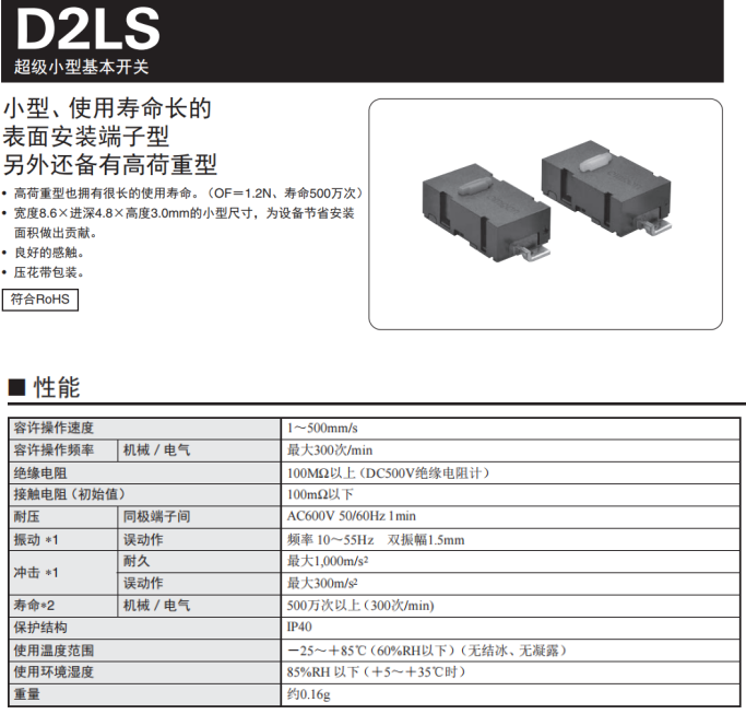 歐姆龍D2LS系列開關(guān),高荷重型也擁有達(dá)到500萬次的電氣壽命,超級(jí)小型身材,寬度8.6*進(jìn)深4.8*3.0mm尺寸,為設(shè)備節(jié)省安裝面積,觸感良好,容許操作速度1~500mm/s,操作頻率最大300次/min,重量?jī)H有0.16g。