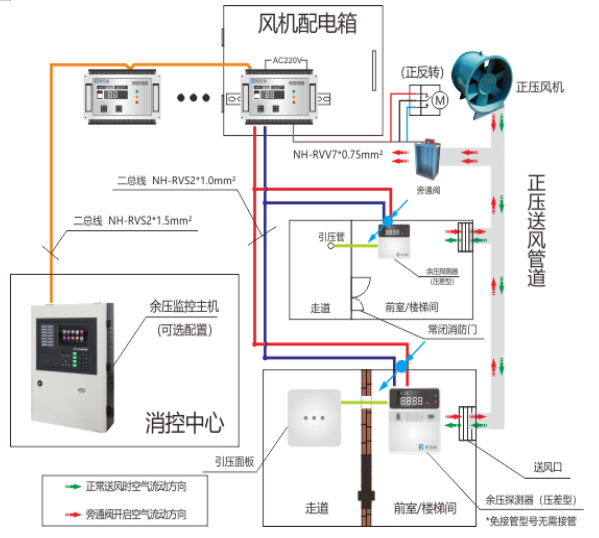 2, 余壓監(jiān)控系統(tǒng)通過余壓探測(cè)器實(shí)時(shí)監(jiān)測(cè)余壓值(前室/走道或樓梯間/走道氣壓差值), 當(dāng)余壓值超過報(bào)警設(shè)定值(前室30Pa, 樓梯間50Pa),余壓探測(cè)器將發(fā)出報(bào)警信號(hào),同時(shí)聯(lián)動(dòng)余壓控制器控制旁通閥開啟,減少正壓風(fēng)機(jī)前室或樓梯間的送風(fēng)量,降低前室或樓梯間余壓值。