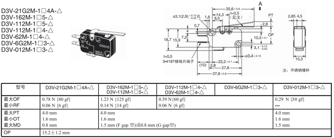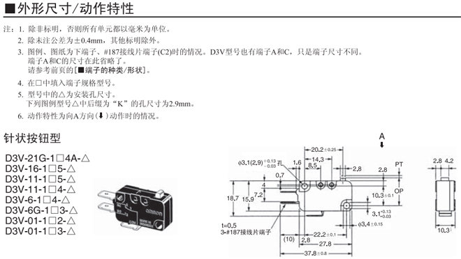 | 針狀按鈕型 | --- | 1.23N {125gf} | D3V-21G-1□4A-△ | D3V-21G-2□4A-△ | D3V-21G-3□4A-△ |