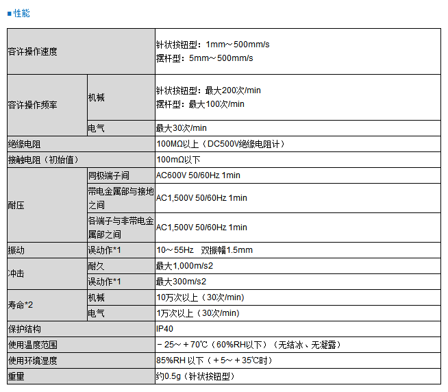 ? ??*1 在針狀按鈕型中為自由位置和動作極限位置的值,在擺桿型中為動作極限位置的值。接點(diǎn)的閉路或開路動作小于1ms。 ? ??*2 關(guān)于試驗條件請另行查詢。