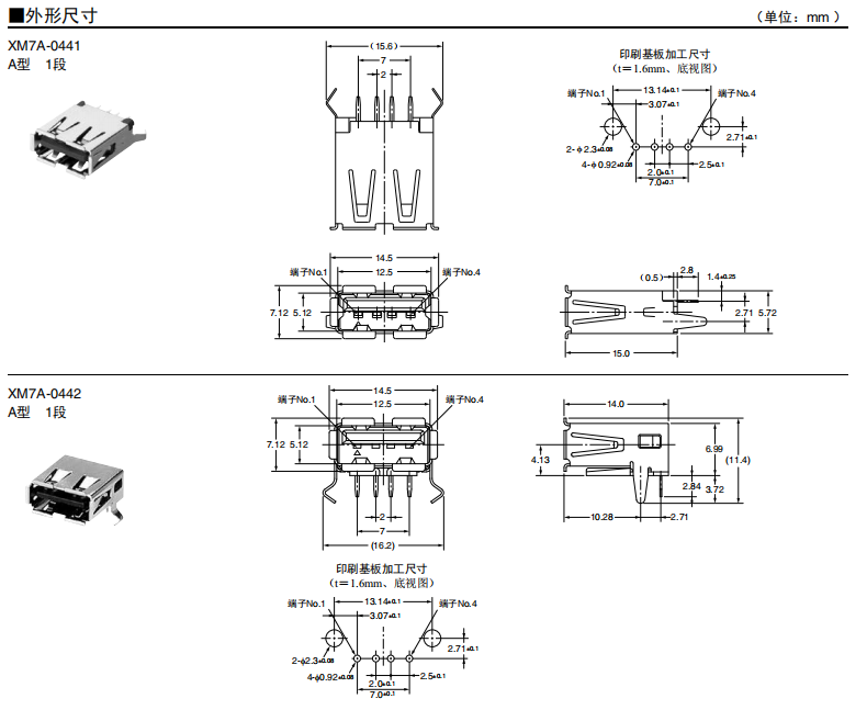 符合USB標準的 小型接口連接器 符合USB2.0標準。 插拔次數可達1,500次。 A型插座封裝在計算機主體、USB集線器等上,B型插座封裝在調制解調器、掃描儀、鼠標等計算機外圍設備上。 有無認證規格,請參見“規格認證”。