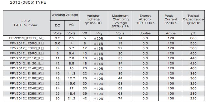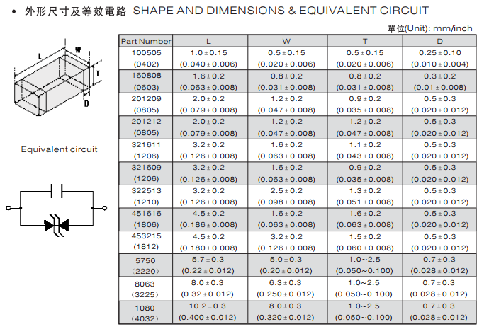 特征: 1、疊層片式陶瓷結(jié)構(gòu)。 2、無引線。 3、溫度范圍:-55℃~+125 ℃。 4、工作電壓范圍V w(dc)=3.3~ 615V。 5、具有雙向限制特性,適合ESD保護(hù)。 6、漏電流非常小。 7、寄生電感小、響應(yīng)速度快(響應(yīng)時(shí)間少于0.5ns)。 8、優(yōu)良的溫度系數(shù)。 9、良好的焊接性能(端電極為三層電鍍)。 應(yīng)用: 1、防止過電壓:當(dāng)施加的電壓升高到壓敏電壓時(shí),壓敏電阻器的電流急劇上升,被保護(hù)設(shè)備的浪涌電壓迅速減小,從而使裝有壓敏電阻器的設(shè)備抗浪涌噪聲能力達(dá)到相應(yīng)要求。